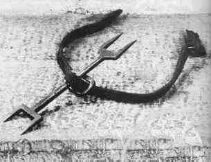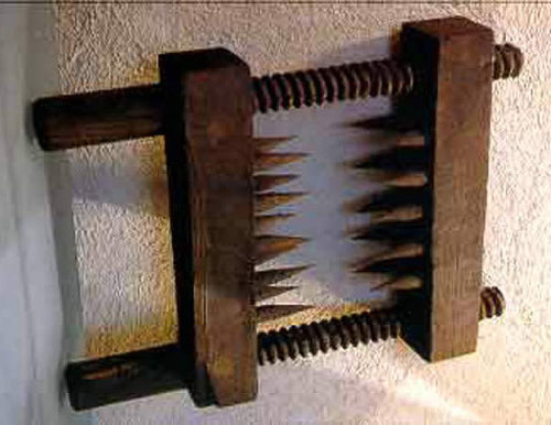 This device is usually connected to a handle and looks like a torturer’s hand in size and configuration. It is used to tear and rip away the flesh from the bone in any part of the body of the victim.