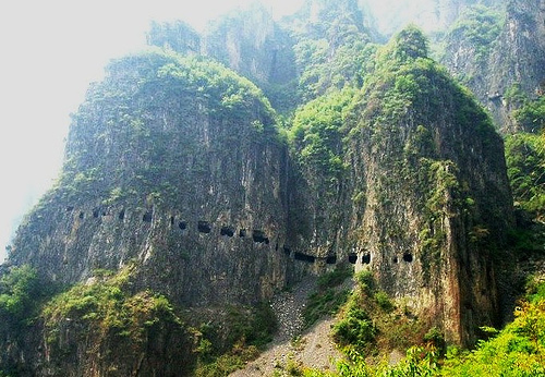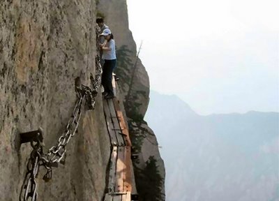 Traveling through this road can give you a really hair-raising experience. This is a heavy-tourist traffic area in Xian (Mt.Huashan). The hanging wooden planks are a real tourist hike path, which many adventure lovers try to navigate.
